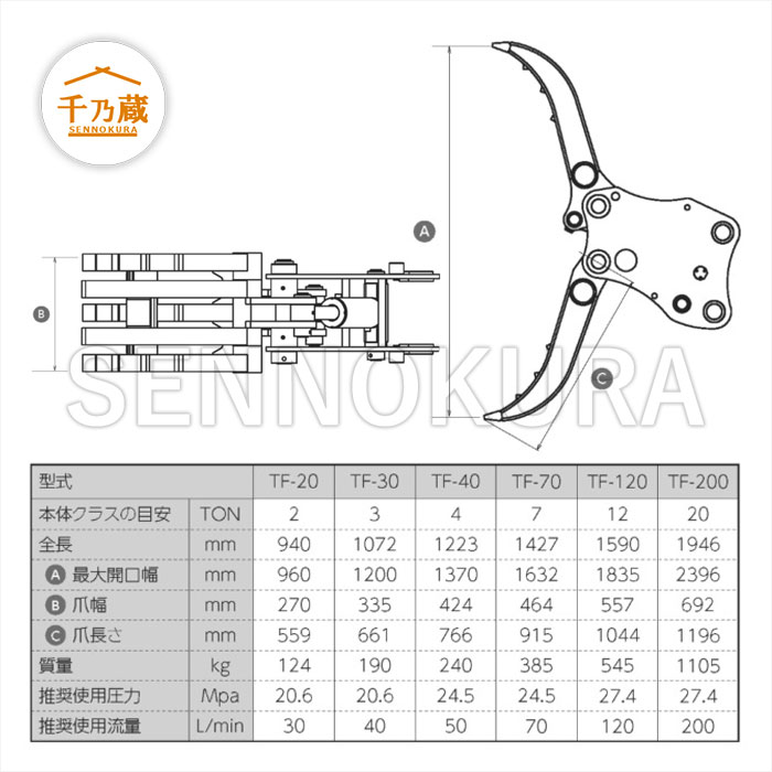内臓油圧シリンダーで爪の開閉作業を行え、
