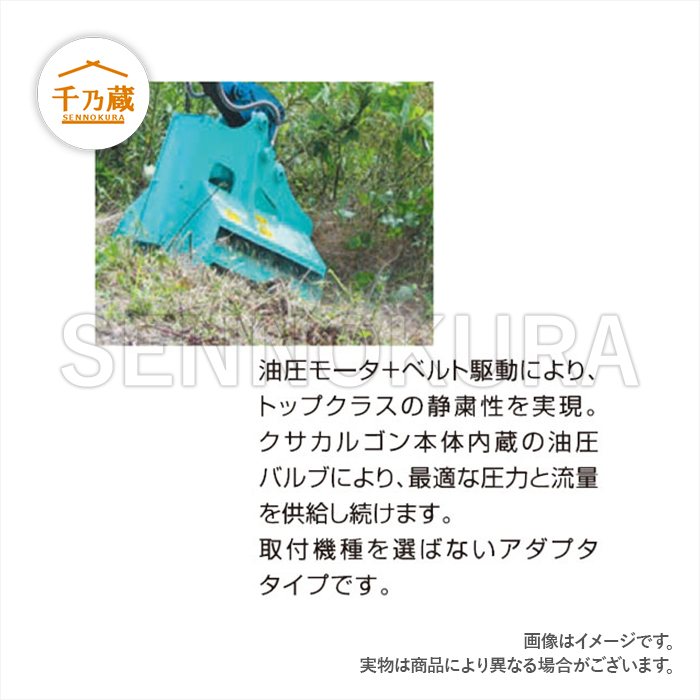 法面や斜面でも、きれいに刈り込むことができ、雑草・雑木はもちろん、竹やぶの刈り取りも可能です。ハンマーナイフ方式の採用により雑草・雑木は強力に粉砕、回収処理が不要です。クサカルゴン本体内蔵の油圧パルブにより、最適な圧力と流量を供給し続けます。