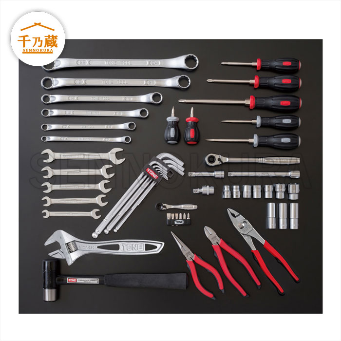 一般工具を厳選したツールセット。 【外寸】433(W)×220(D)×240(H)mm 【カラー】ダークシルバー 【重量】11.5kg 【セット内容】57点 【差込角】9.5mm ■特長 ・V形3段式の天面フラットタイプ ・全段プラスチックトレー付きでメタルケース仕様 ・自動車のメンテナンスに適した工具の標準セット ・セット内容は全部で57点 ※数量限定のため、欠品する場合がございます。ご了承ください。