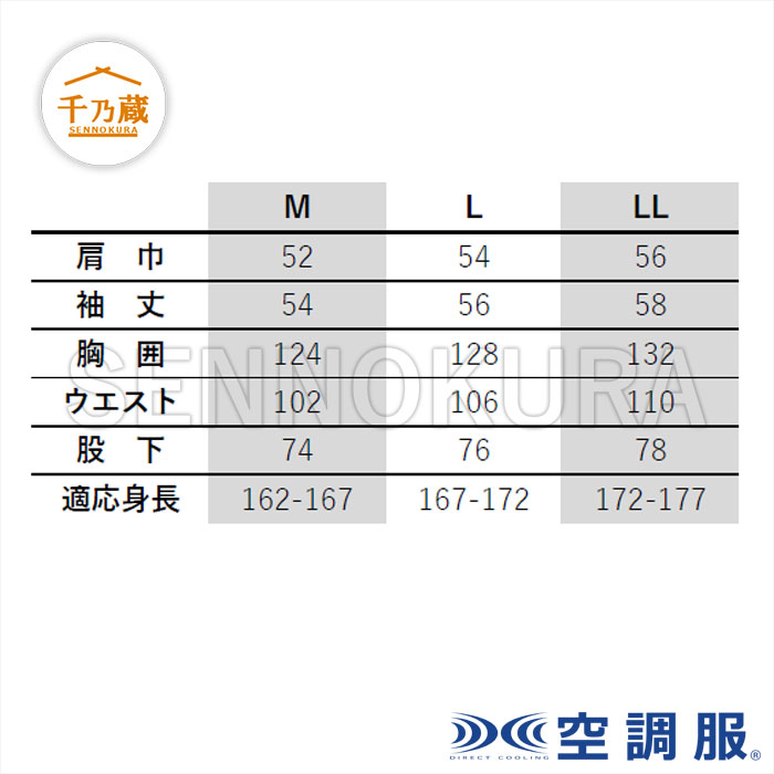 ●Mサイズ:適応身長162-167×肩幅52×袖丈54×胸囲124×ウエスト102×股下74●Lサイズ:適応身長167-172×肩幅54×袖丈56×胸囲128×ウエスト106×股下76●LLサイズ:適応身長172-177×肩幅56×袖丈58×胸囲132×ウエスト110×股下78
