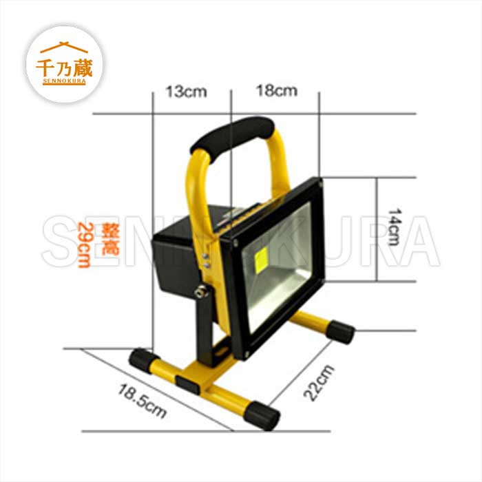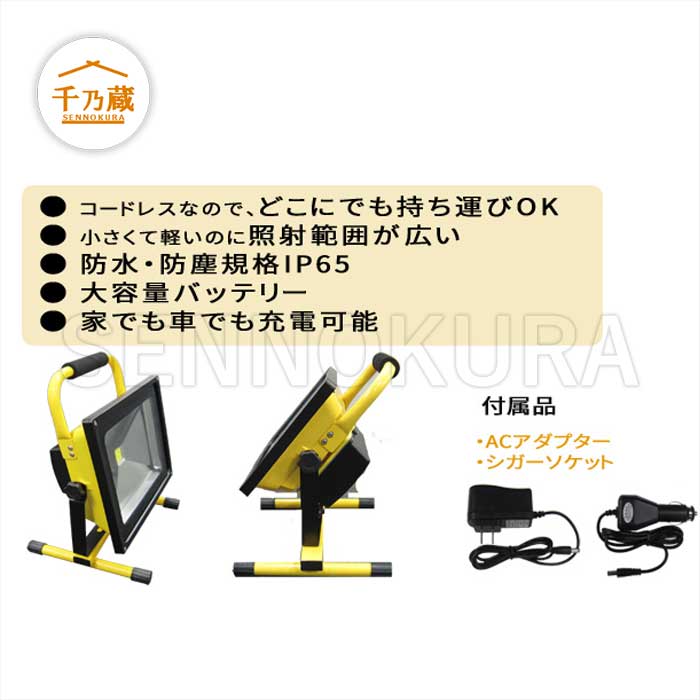 【商品仕様】 ● LED POWER:20W ● 光度:1600-1800lm ● 充電時間:5.5h ● 点灯時間:4h ● サイズ:22×18.5×29cm ● 重量:1.8kg ・コードレスなので、どこにでも持ち運びOK♪ ・小さくて軽いのに照射範囲が広い ・防水、防塵規格IP65 ・大容量バッテリー ・家でも車でも充電可能 【付属品】 ACアダプター シガーソケット